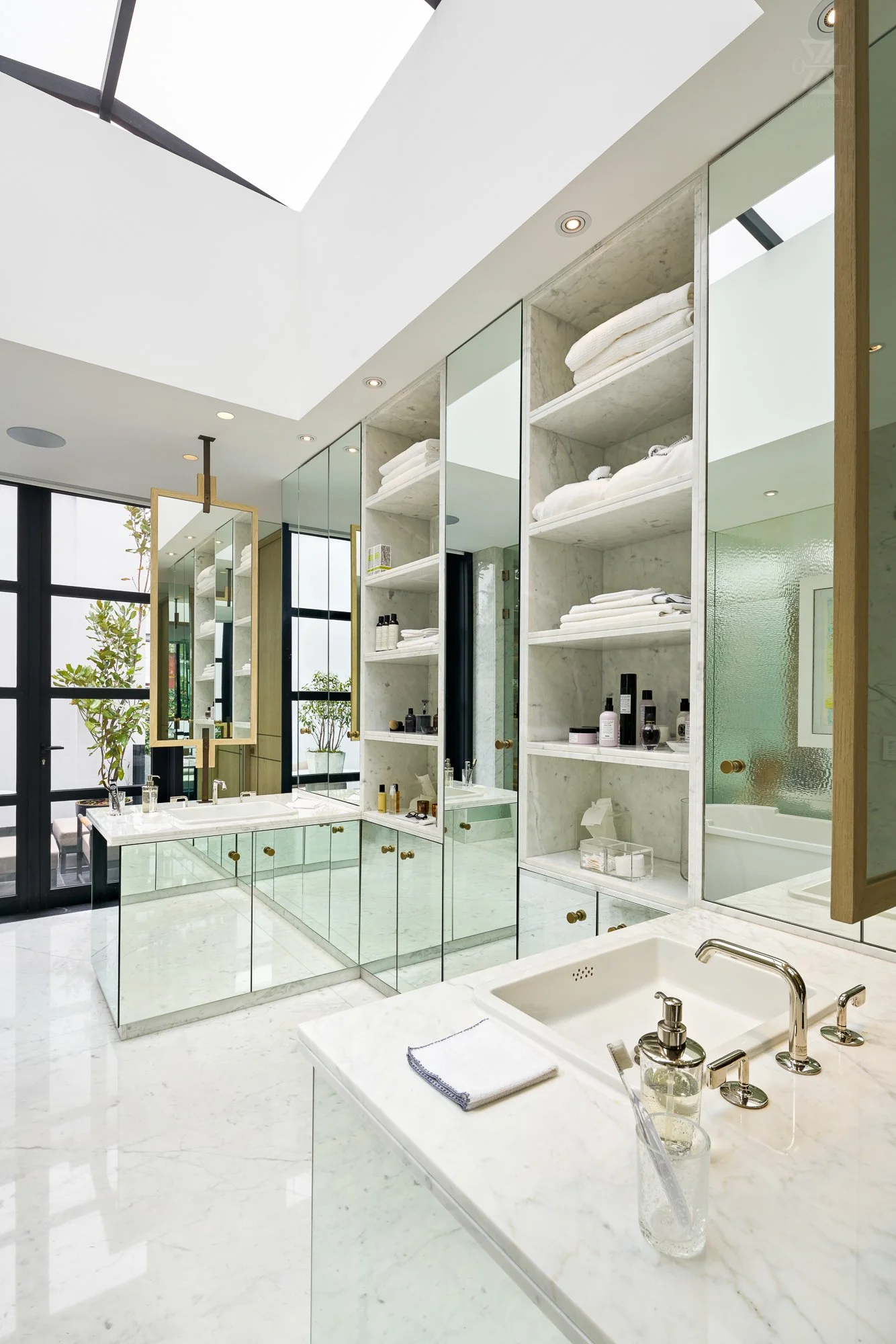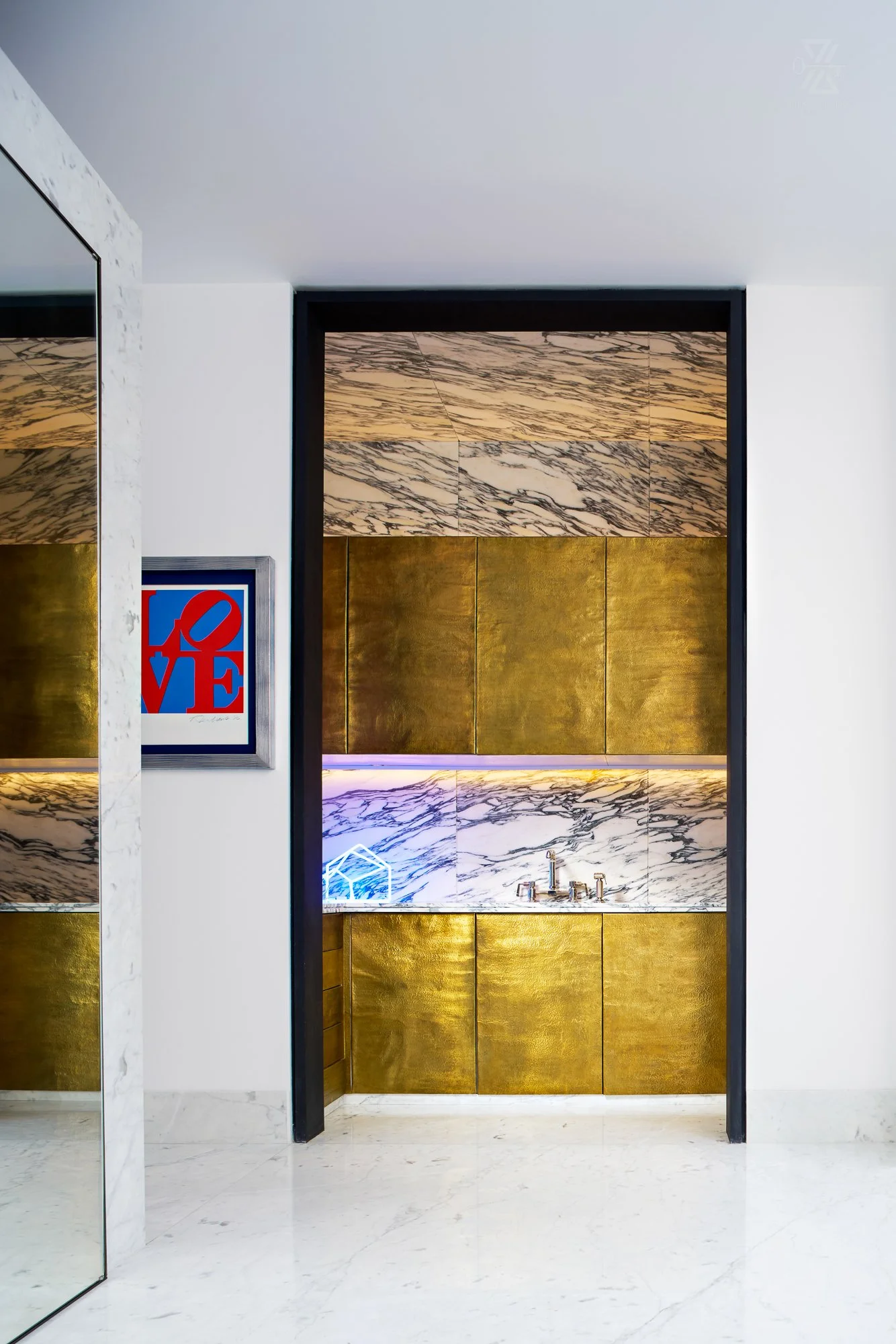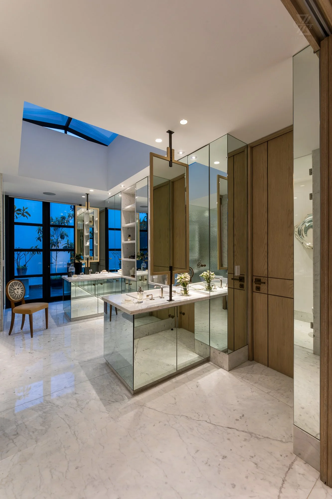 THE RESIDENCE OPENS TO A STRIKING FOYER WITH AUTOMATED MIRROR PARTITIONS THAT CONCEAL TWO GUEST POWDER ROOMS. CLAD IN ANTIQUE MIRRORS, THESE JEWEL-BOX-LIKE SPACES CREATE AN IMMEDIATE SENSE OF OPULENCE. HIDDEN ELEMENTS ON THIS LEVEL INCLUDE A PRIVATE GYM THAT CAN DOUBLE AS ADDITIONAL GARAGE SPACE, A SECONDARY HOME OFFICE, AND A DEDICATED PANTRY FOR FINE TABLEWARE.
