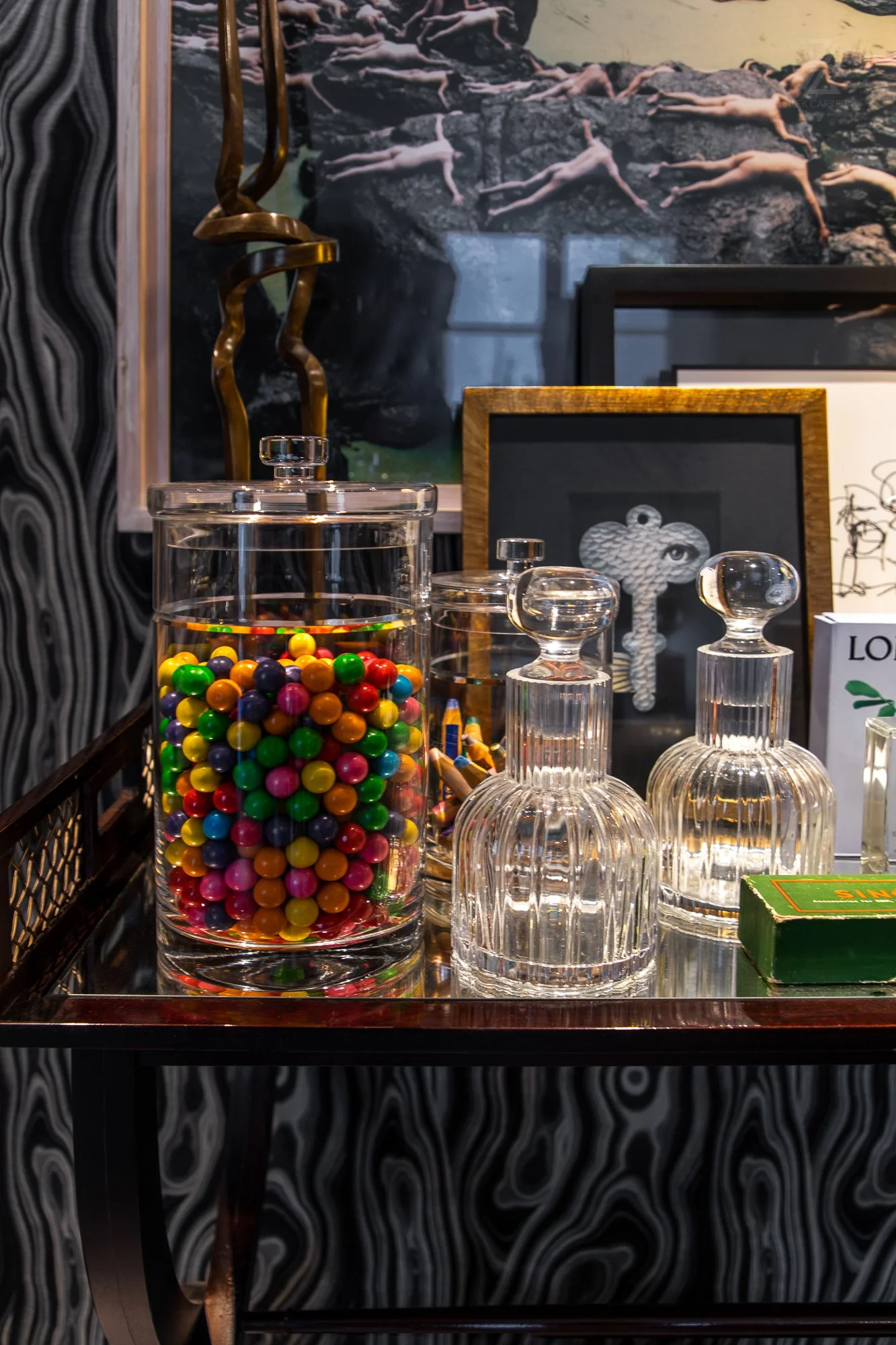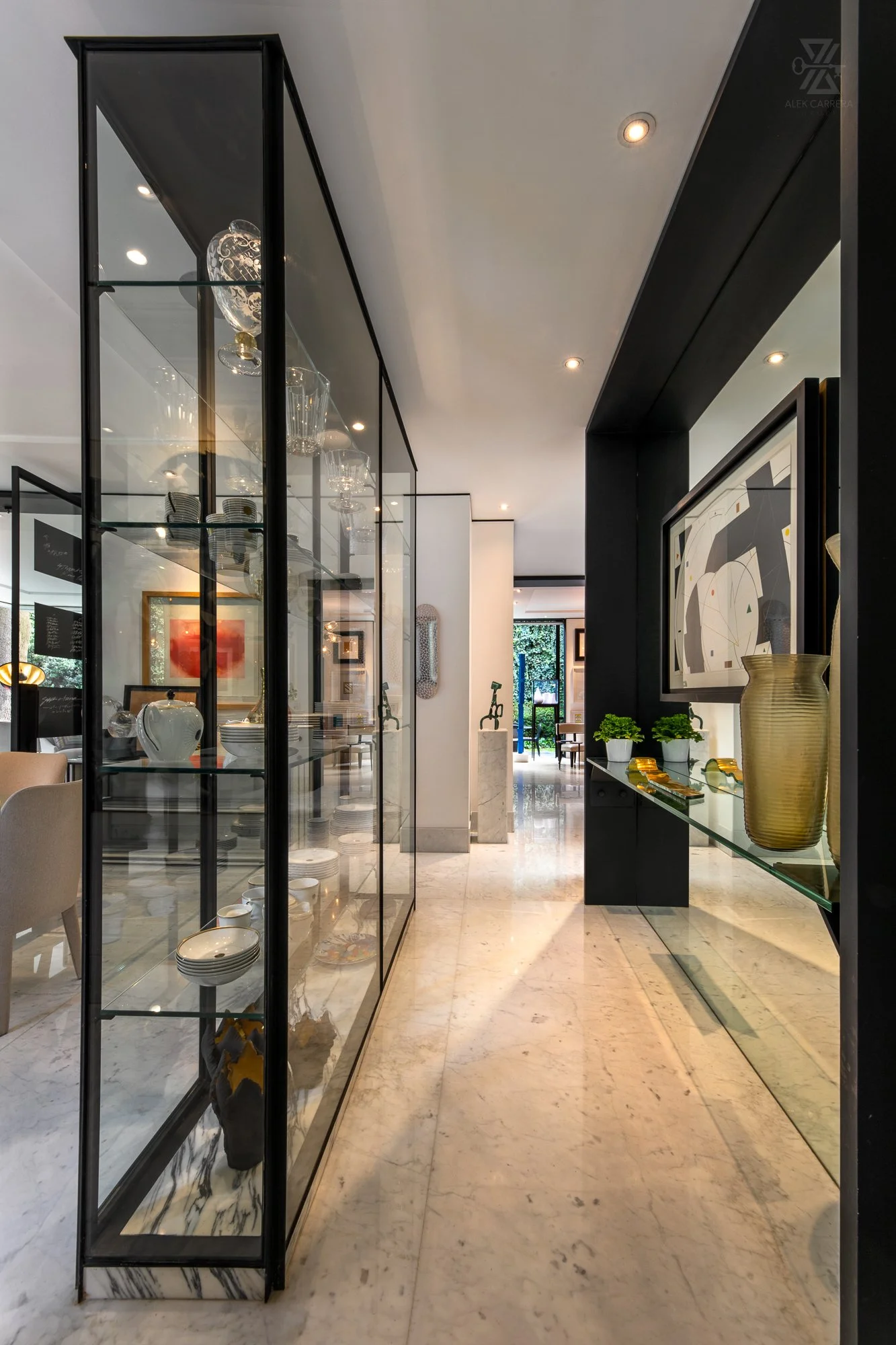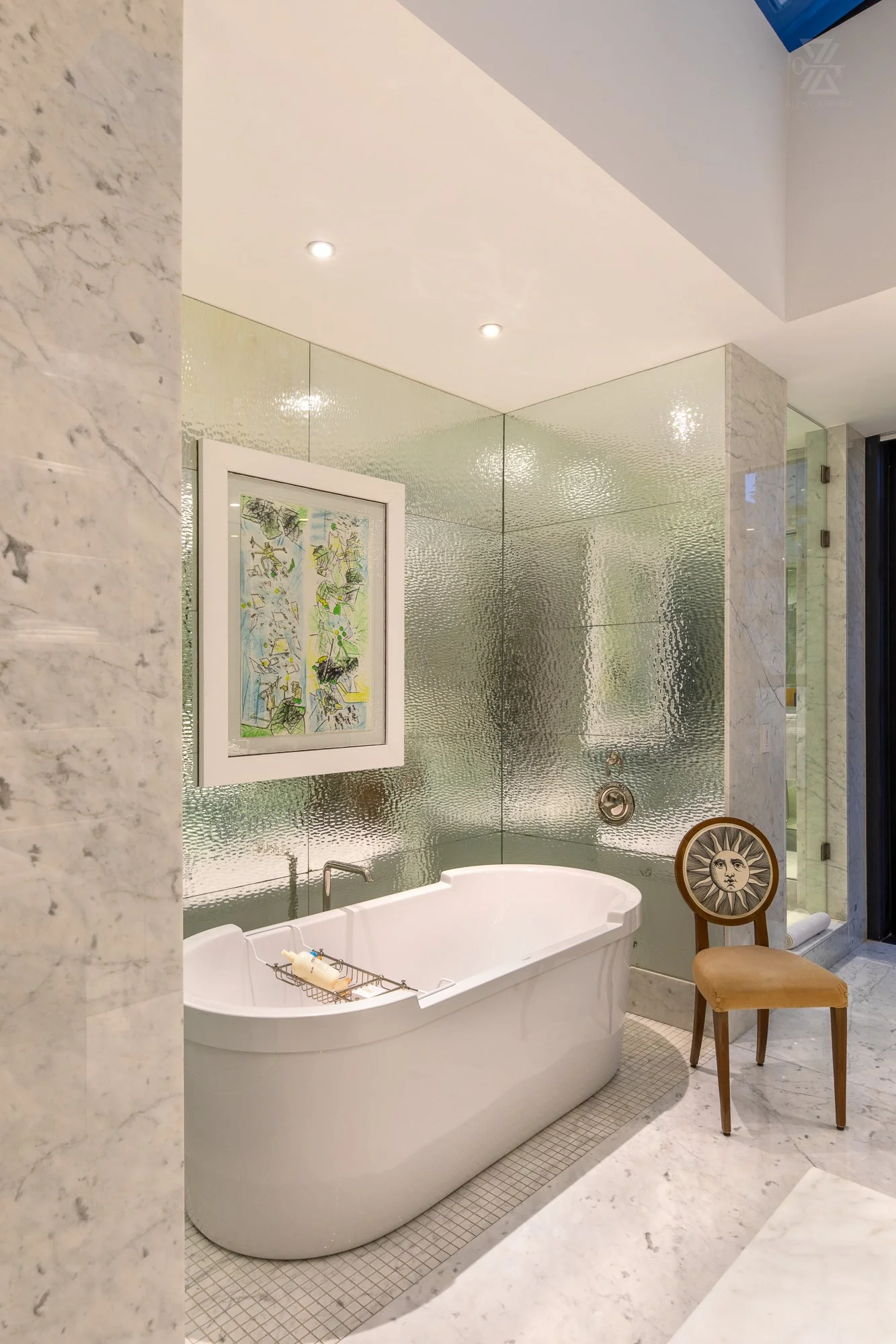 THE RESIDENCE OPENS TO A STRIKING FOYER WITH AUTOMATED MIRROR PARTITIONS THAT CONCEAL TWO GUEST POWDER ROOMS. CLAD IN ANTIQUE MIRRORS, THESE JEWEL-BOX-LIKE SPACES CREATE AN IMMEDIATE SENSE OF OPULENCE. HIDDEN ELEMENTS ON THIS LEVEL INCLUDE A PRIVATE GYM THAT CAN DOUBLE AS ADDITIONAL GARAGE SPACE, A SECONDARY HOME OFFICE, AND A DEDICATED PANTRY FOR FINE TABLEWARE.