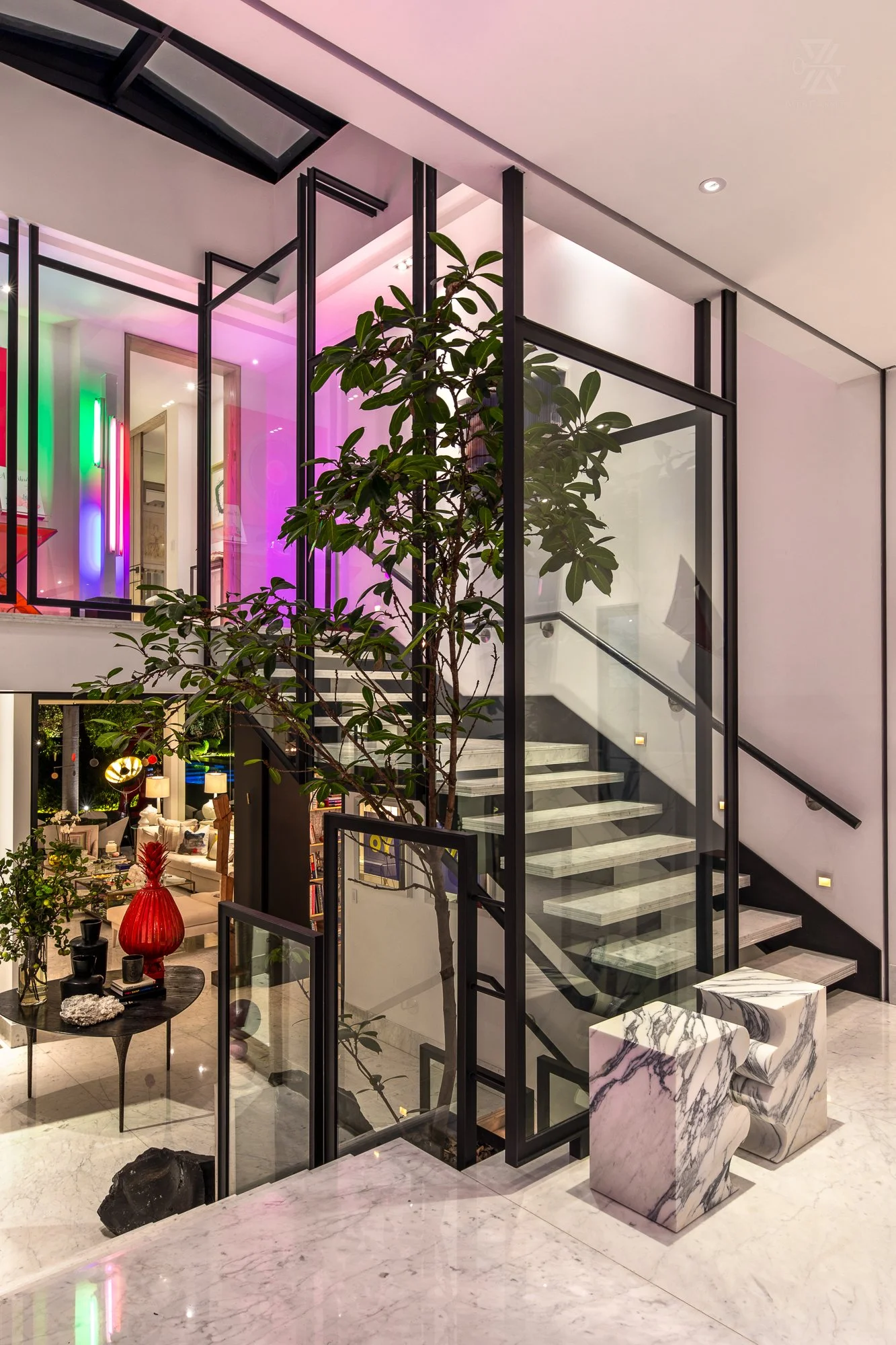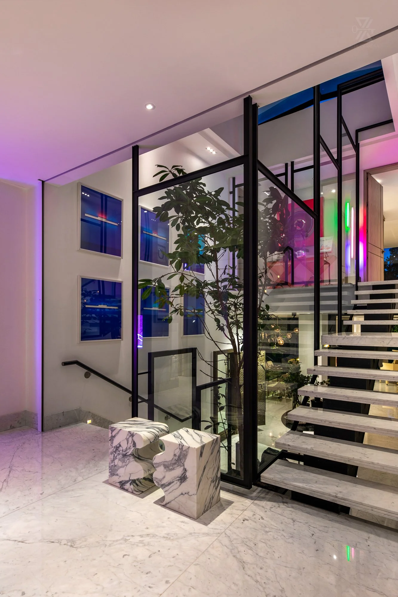 A SCULPTURAL STAIRCASE CRAFTED FROM IRON, GLASS, AND MARBLE ANCHORS THE HOME, SERVING AS BOTH A DESIGN STATEMENT AND A SEAMLESS CONNECTOR BETWEEN PRIVATE AND PUBLIC SPACES.