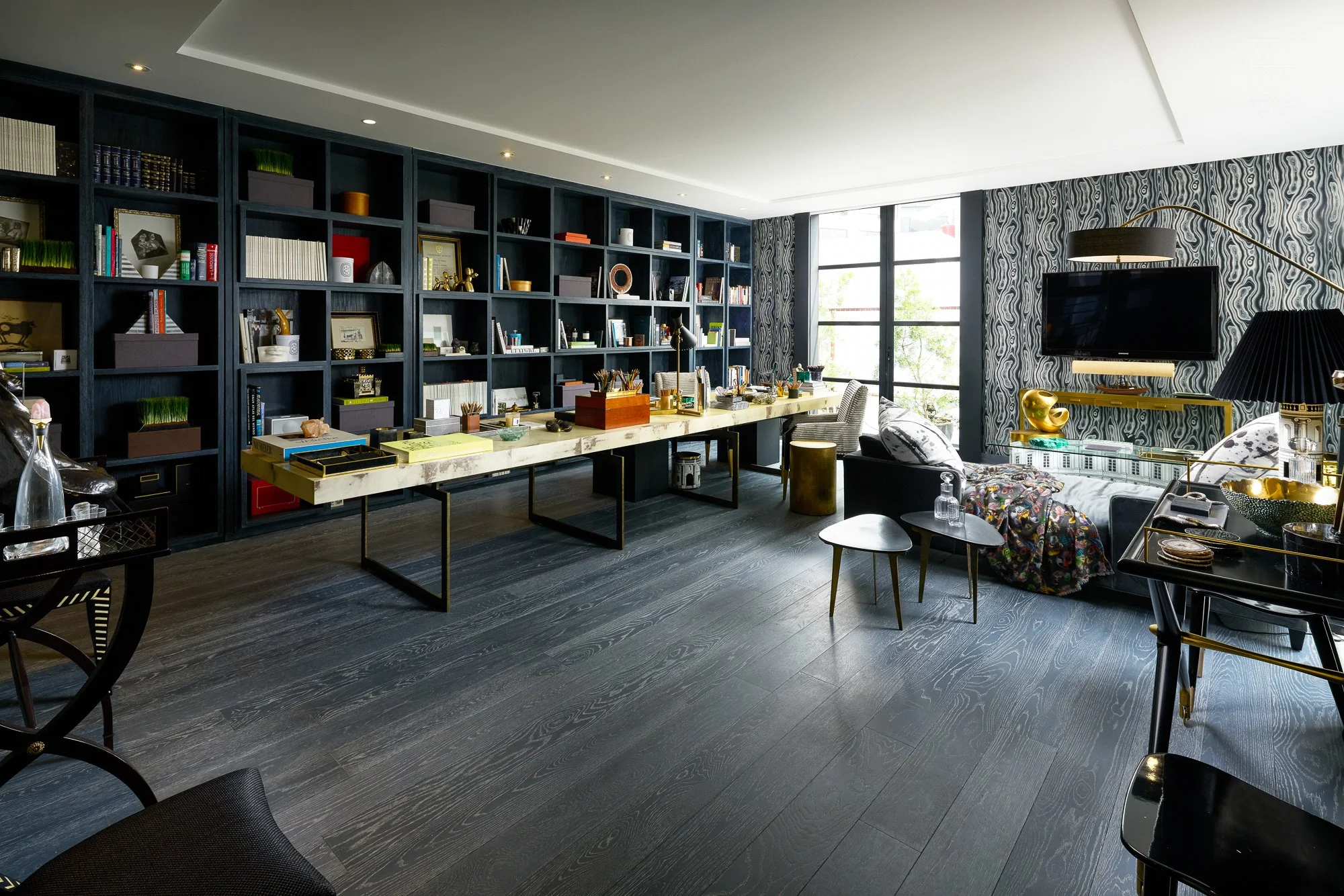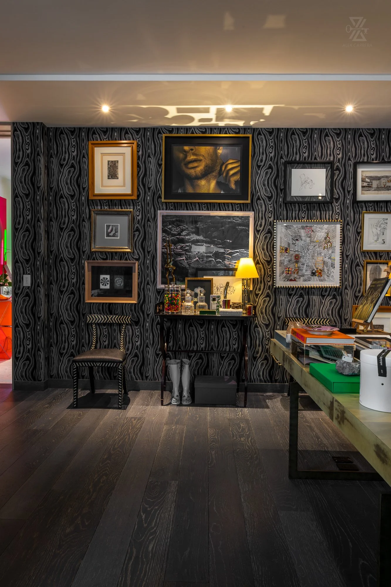 ADORNED WITH LEATHER FLOOR TILES IN A PALETTE OF OFF-WHITE AND RED, THE LIBRARY FEATURES AN EXCEPTIONAL COLLECTION OF DRAWINGS BY RENOWNED INTERNATIONAL ARTISTS, AS WELL AS ART BOOKS AND RARE OBJETS D’ART.