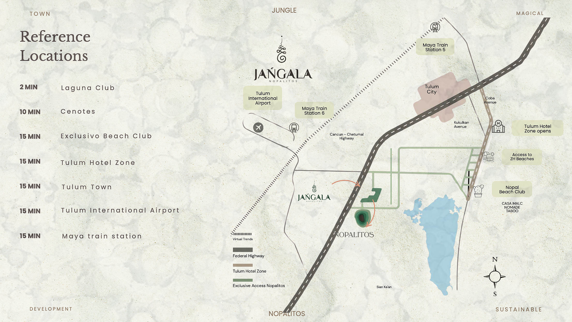 JAŃGALA CONNECTS YOU: ENJOY A PRIVILEGED LOCATION WITH DIRECT INTERNAL ACCESS TO TULUM'S HOTEL ZONE, WHERE THE CARIBBEAN SEA AWAITS. THE VIBRANT TOWN OF TULUM IS EQUALLY CLOSE, OFFERING THE ESSENCE OF THE MAYAN LAND. FOR YOUR CONVENIENCE, THE PROXIMITY TO TULUM INTERNATIONAL AIRPORT ENSURES SMOOTH AND FAST AIR CONNECTIONS.