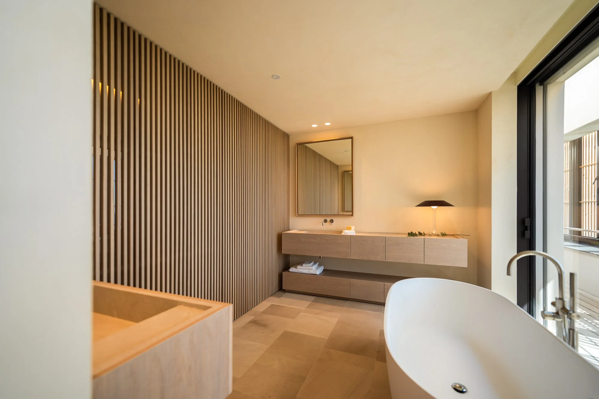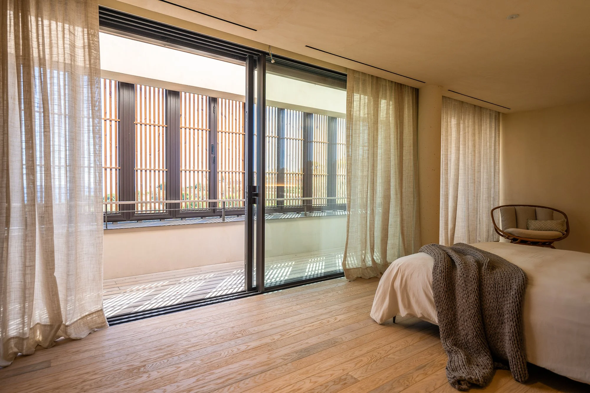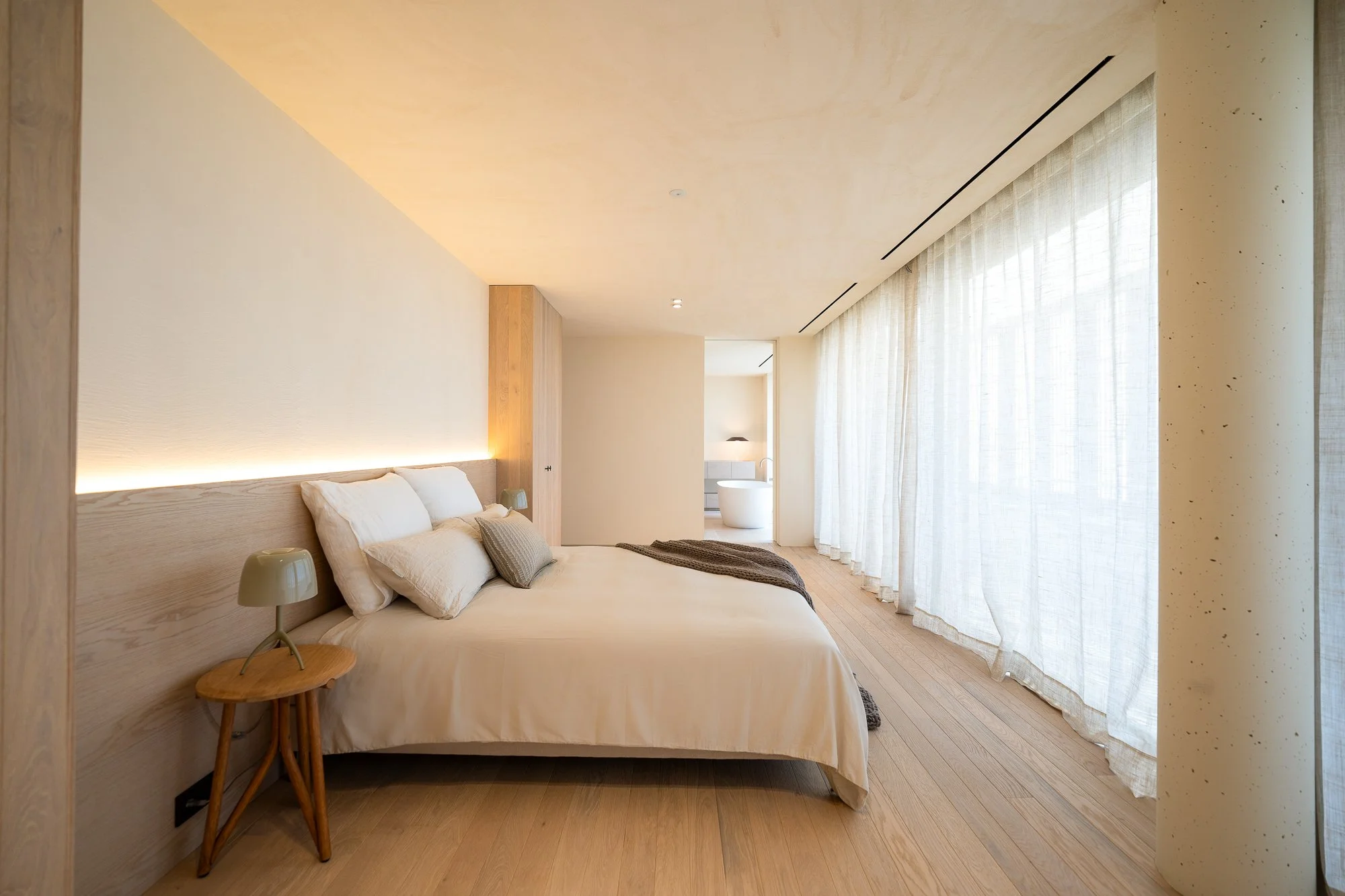 THE UPPER FLOOR HOUSES A LUXURIOUS PRIMARY SUITE WITH A WALK-IN CLOSET, SKYLIGHT, AND EN-SUITE BATHROOM. TWO ADDITIONAL DOUBLE BEDROOMS, EACH WITH EN-SUITE BATHS AND DIRECT ACCESS TO A TERRACE WITH MESMERIZING SEA VIEWS, COMPLETE THIS LEVEL.