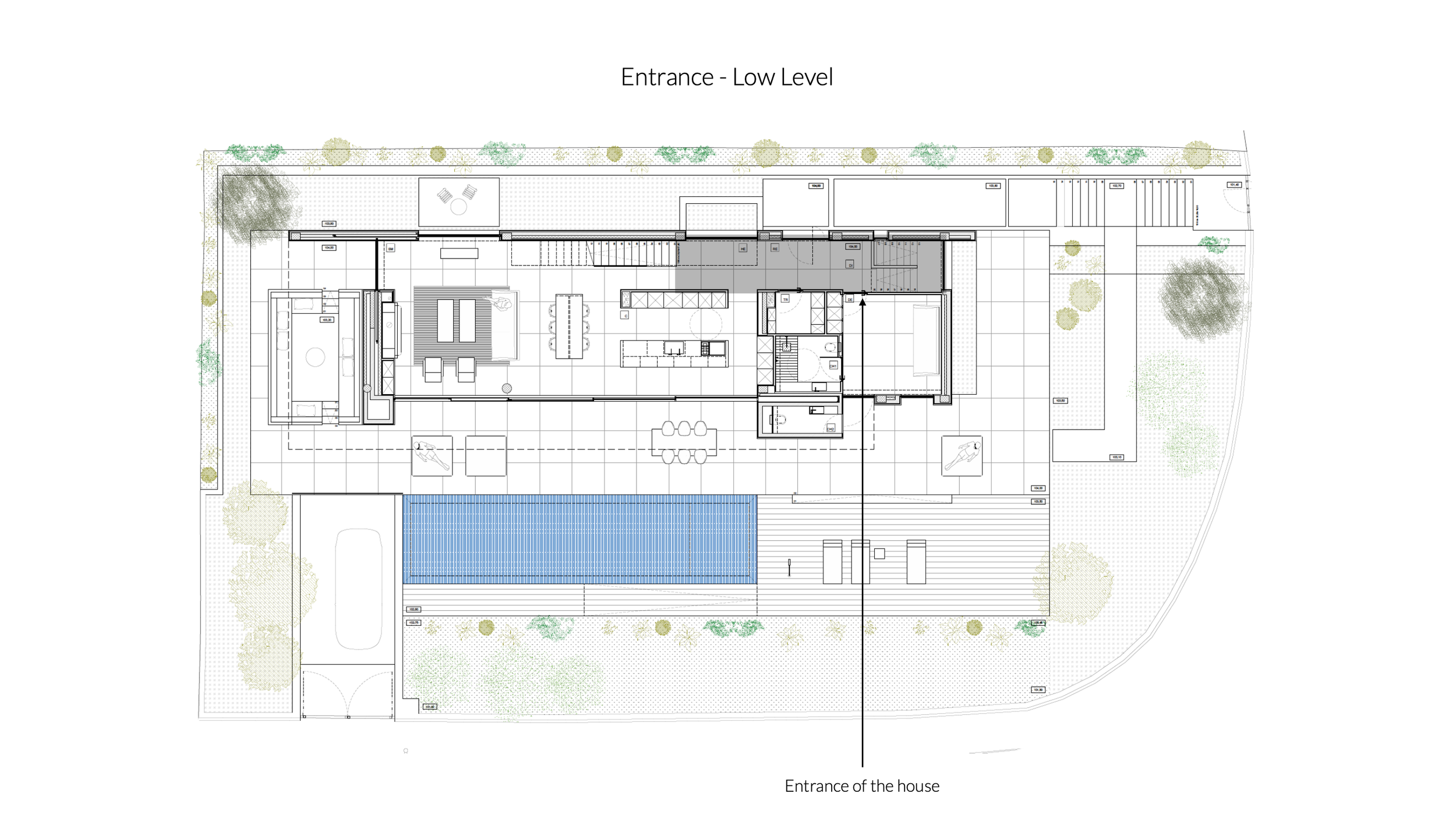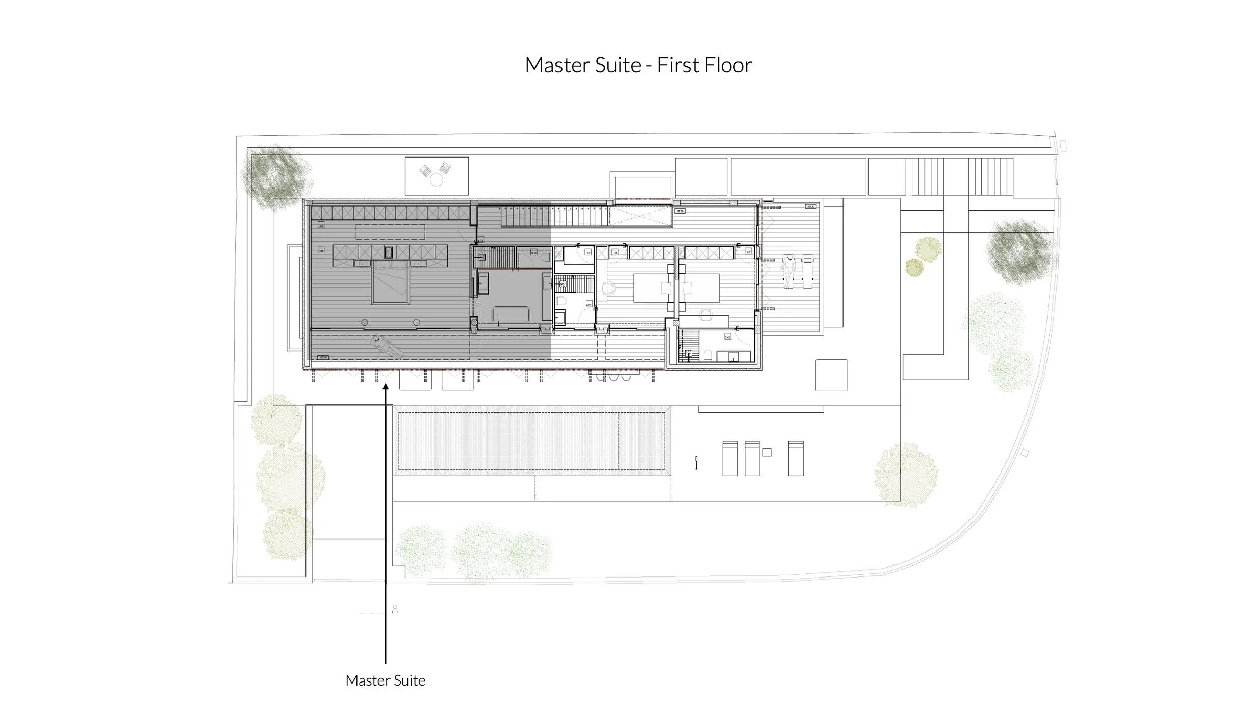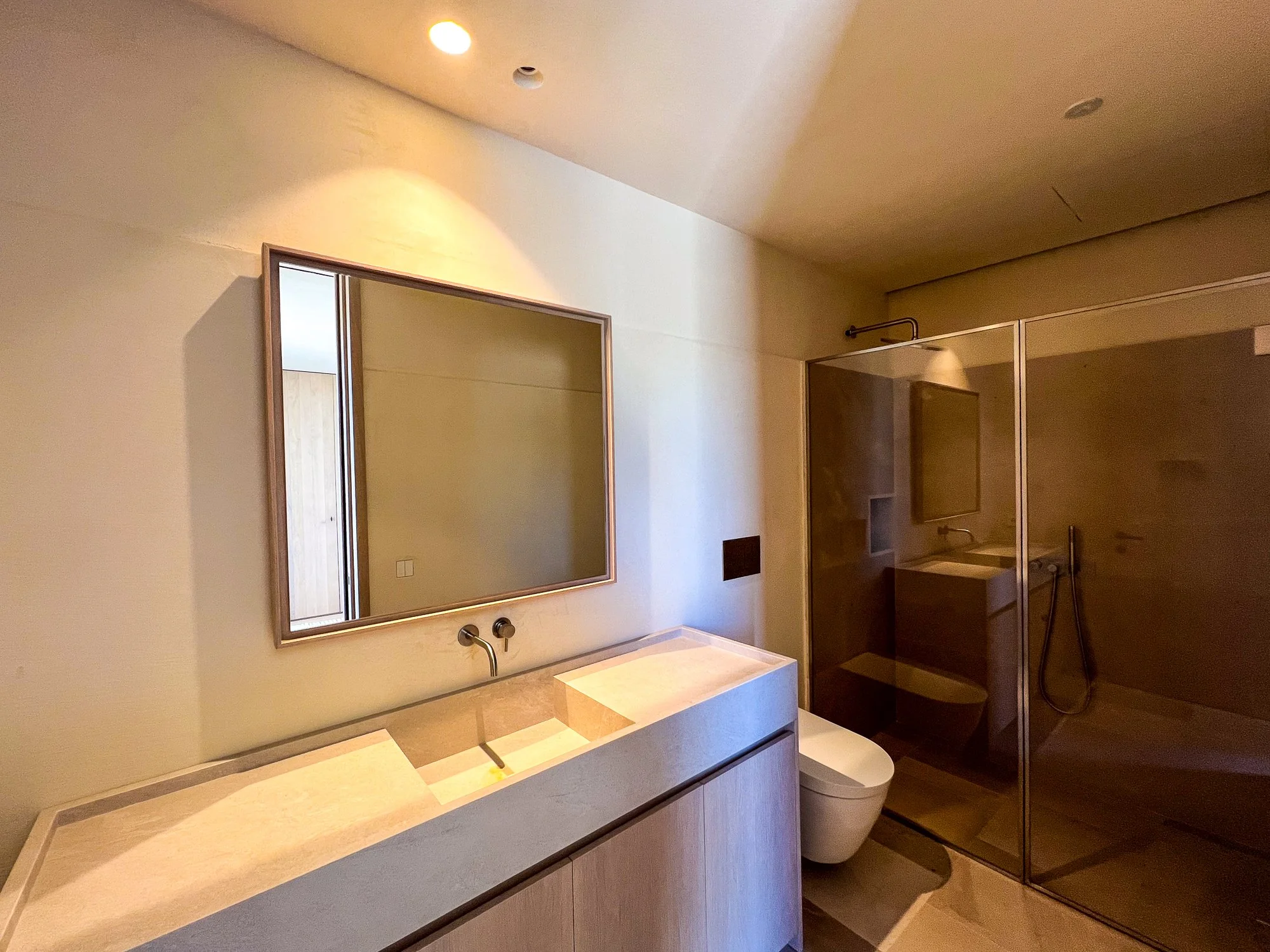 THIS LEVEL ALSO INCLUDES A PRIVATE OFFICE WITH ITS OWN BATHROOM, AS WELL AS AN ADDITIONAL OUTDOOR BATH AND SHOWER SERVING THE POOL AREA. A GLASS-RAILED STAIRCASE CONNECTS THE GROUND FLOOR WITH THE UPPER LEVEL, ADDING AN ELEMENT OF ARCHITECTURAL FINESSE.