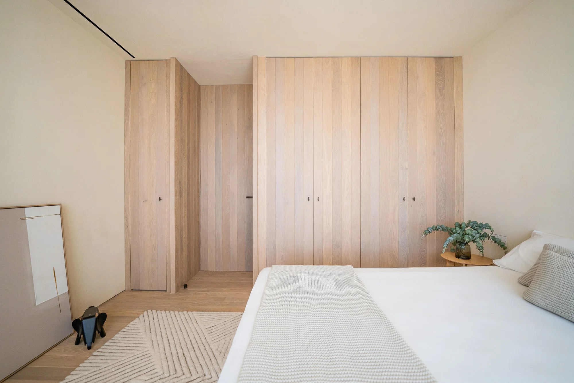• WARDROBE FRONTS WITH. FOLDING DOORS, MATERIAL, AND FINISH WITH WOODEN FLOORING SLATS.